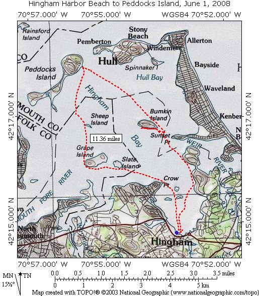 June 1, 2008 -- Hingham Harbor Beach to Peddocks Island. (Photos lost) [Index] [Map]