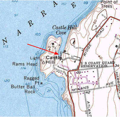 Castle HillCove, Coast Guard Station, Newport: (CRMC designation n/a)Directions from downtown Newport. Take signs to Ocean Drive. Followroute via Wellington, via Halidon, via Harrison, via Ridge Road, pastthe entrance to Castle Hill Coast Guard Station. Take right ontoCoast Guard Drive (still following directions to Ocean Drive). Takeslight jog onto Collins Beach Road which is the access to the CastleHill restaurant. The launch sight will be seen to the right down bythe cove. This site is a rocky dirt shoreline suitable for hand launchingonly. Parking regualtions at the Castle Hill Coast Guard Stationare not known. Cars not going up to the restaurant are not allowed to park in their parking lot. There is a portable toilet next to the launch site.