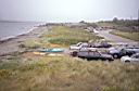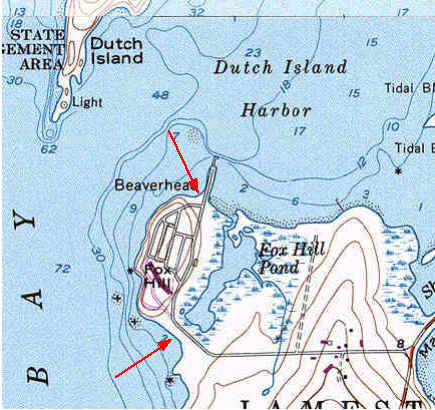 Fort Getty Park, Jamestown: (Town owned public access. Note this is not a Rhode Island State Park.) Directions from Jamestown Bridge, take North Main Road exit, head south to stoplight, continue thru on Southwest Ave., swing right across to the causeway. If coming from the Newport Bridge, exit to downtown Jamestown and go south on Canonicus Ave (ie the main street thru town) and turn right on to Hamilton Ave. From both directions proceed across causeway on Beavertail Road (just past beach on left) to entrance of Ft Getty. Kayaks can be launched on the beach on the west side of the pier road or on the east side using the concrete boat launch ramp. The left and right photos above show the west and east launch sites. This recreation facility is the site of a World War I and World War II fortifications to guard the entrance to Narragansett Bay. It is popular in the summer for camping, with a total of 100 campsites for trailers (many renting for the whole summer), and 25 for tents. The camp site has bathroom and shower facilities. Ample on-site parking is available. There is a $10 entrance fee in the summer thru Oct.