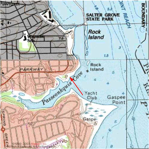Passeonkquis Cove (Gaspee Pt Drive), Warwick: (CRMC listed as abandoned, but listed as State Ramp) Directions from Rt 95 heading south. Use Exit 14 (Rt 37) to get to Rt 1 and head south to Airport Rd (north end of Green Airport) From Rt 95 heading north use Exit 13 (the Airport connector) to get to Rt 1 and head north to Airport Rd. Head east on Airport Rd to Rt 117 and go north to Narragansett Parkway. Turn right on the Parkway and go to where it bends north. Turn onto Gaspee Pt Drive. Follow the narrow residential road to the end. The launch is at the end of the road. with a dirt parking lot on the right which will hold about 10 cars. There no sanitary facilities, but there are bushes for limited discrete privacy.