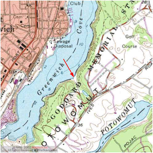 Goddard State Park, East Greenwich: (Rhode Island State Park) Directons from Rt 95, take Rt 4 south, exit at Rt 401 (which comes up quickly) into E. Greenwich. Continue to town and take a right at the stop light onto Main St.(Rt 1) Proceed south several blocks and take left onto Forge Rd at bottom of hill. Continue east on Ives Road to the Park. During summer enter at far end of Park through main extrance, off season can enter at west end thru two large white stone pillars, (not the horse farm/farmers market entrance). This is a year-round facility is managed by the State of Rhode Island. The public boat launch is at the west end of the park, not at the swimming beach area. It is just above the “D” in Goddard on the above map. The large gravel parking lot is huge. Nice because you can park under the trees under a hot summer day. It is also protected from wind on cooler days. During season there are public restrooms available in the Park not too far from the launch.