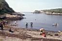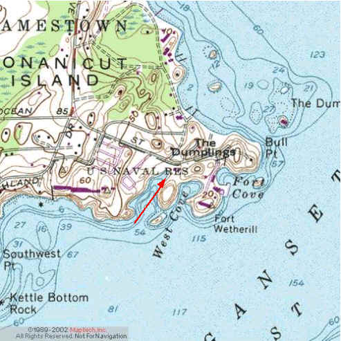 Fort Wetherill State Park, Jamestown: (State Park Area) Directions from either the Jamestown or Newport Bridges. Follow Rt. 138 and exit into downtown Jamestown on the East side of the island. Head south on the main steet which turns into Walcott Ave., turn left at the sign for Ft. Wetherill. Follow this road to the park, turn right into the park (Brick restrooms on right) then take a quick left to the boat launch parking area. There is plenty of on-site parking, but the site is popular with scuba divers on the good weekends the lot can fill early. Additional parking is available up the road in the main Park Lot. There are two portable toilets near the launch site during the summer season. This site offers a protected launch from almost all weather conditions. In addition to the ruins of Fort Wetherill, much of this State facility consists of a grassy lawn and picnic tables fringed by rock bluffs overlooking sheltered coves and cobble beaches.
