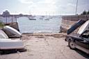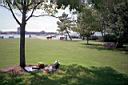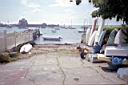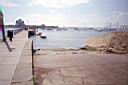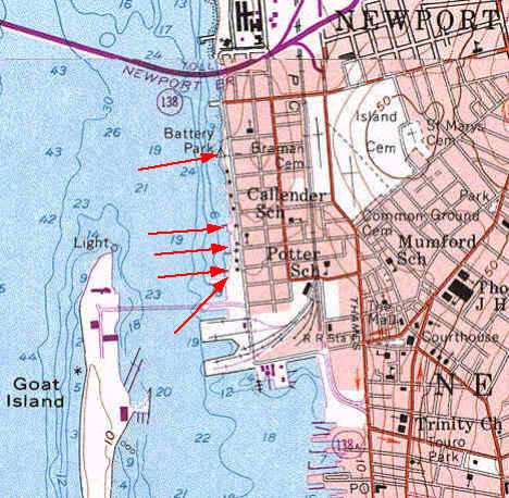 Battery Park, Washington St, Newport (CRMC- designated public access) Directions from the Newport Bridge, exit Bridge to business district onto (Rt 238) Farewell St. south. At first light take right onto Zandt St. This will take you to Washington St at the north end of Battery Park. From north on Rt 114 or Rt 138, stay on 138 as going to the Bridge, but get on Rt 238 and do as above. Washington St parallels the waterfront, with many perpendicular streets crossing it and abutting the Bay. All the streets down to the Goat Island causeway are public access. But only some of them have boat launch ramps. Some are used as personal parking lots and some have the appearance of being adopted as private property. The photos below show the respective ones that have ramps. Parking on the street is limited but public during daytime. Restricted parking is limited to residents only from 6pm – 6am, May – Oct. In other words no evening parking during the summer season. Parking can be found off season easily and during the weekday. Weekends is more difficult anywere. The photos start at Battery Park on the north end.
