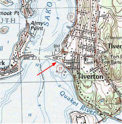 Old Stone Bridge Fishing Pier, Tiverton: (CRMC designated public access) Directions from Rt 24/Rt138 north or south. Exit at Rt 77 (Exit 5) to Tiverton. Continue south on Rt 77 to the site which is he eastern abutment of the 1907 stone bridge that was destroyed by Hurricane Carol in 1954. Kayaks can be only launched conveniently on the south side of the granite bridge foundations. There are very strong tidal currents in the passage between the two abutments. Plan your direction of paddleing accordingly. Tiverton has their town beach there and charges a parking fee for non-town residents during the summer season in the daytime. The public restrooms are only open when the beach is open.