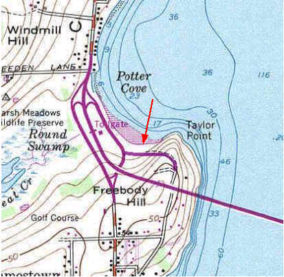 Potter Cove/Taylor Point, Jamestown: (CRMC designation n/a, town road) Directions from Rt 138 east or west, exit to Jamestown Village and swing around the rotary to the left, as if going back north, then immediately exit to the right on Freebody Rd. If you see the beach on your right, you have missed Freebody Rd. Note: Some maps list it as Bayview Dr. It is also accessable from Mt Hope Ave across from the golf course, just beyond the rotary. This site provides access to the East Passage on a long narrow beach along Potter Cove. The beach can be reached by stairs descending from the parking lot along the road. Farther back up Bayview Dr. another parking lot has access to Tayler Point which affords a good view of the bay but has no launch area. There are no sanitary facilities at the site but heavy bushes provide discrete privacy.