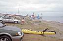 The beach is located on the right, (map) via either of two dirt roads just beyond the General Dynamics buildings. The beach is very popular with the small (Hobie type) catamaran sailboats. There are no sanitary facilities, but the new high speed ferry terminal next to the site has portable toilets. Parking is on dirt road above the beach.