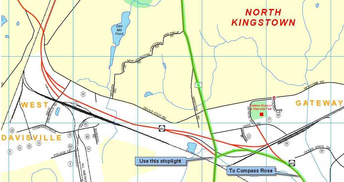 at the first stoplight take the exit to Rt 403 east to Quonset Pt.