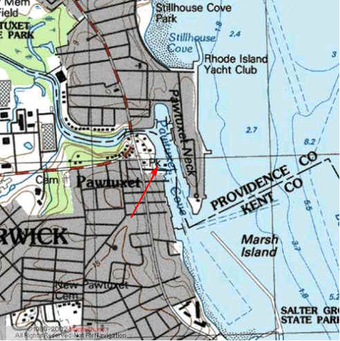 Pawtuxet Cove beside the Aspray Boathouse in Pawtuxet Village – Warwick: (CRMC designation public access) From south of Providence, take 95 North to exit 14A and follow signs for Rte 1 North, which is the Post Road. Stay on the Post Road for 2.7 miles to a stop light where the Post Road Ts into Narragansett Parkway. You will be looking across a small park at Pawtuxet Cove. Turn right and almost immediately left into Pawtuxet Park. From the north take 95 South to exit 18 (Thurbers Avenue) and follow signs for Rte 1 South (left at bottom or ramp and right at blinking red light. Allens Avenue becomes Narragansett Boulevard, comes into a residential area, and comes close to the Providence River. At the only stop sign turn right onto Ocean Avenue, go up two blocks to Broad St, and turn left onto Broad St. Drive through Pawtuxet Village, cross the bridge over the Pawtuxet River, and stay to the left onto Narragansett Parkway. Look for a wooden sign for Pawtuxet Park, which has a white gazebo in the middle. The Boathouse is south of the park at the water. There is a ramp to the right of the Boathouse as you look at the water. At low tide the launch is thru mud. Ther is ample parking, but no sanitary facilities.